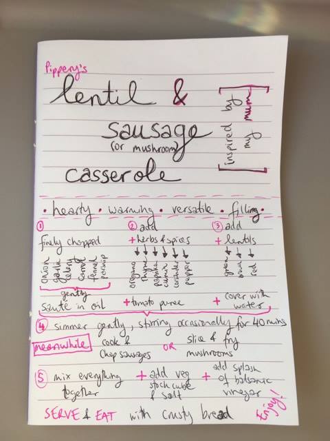 This recipe is inspired by the lentil and sausage casserole my mum used to cook for us regularly when I was growing up. It’s hearty and filling and it’s versatile as you can use up different types of veg in it, most herbs and spices will work and you can eat it with different things. If you want a vegan version, just leave out the sausages and cook some mushrooms instead. And you can easily make it gluten-free if you choose gluten-free stock and sausages.